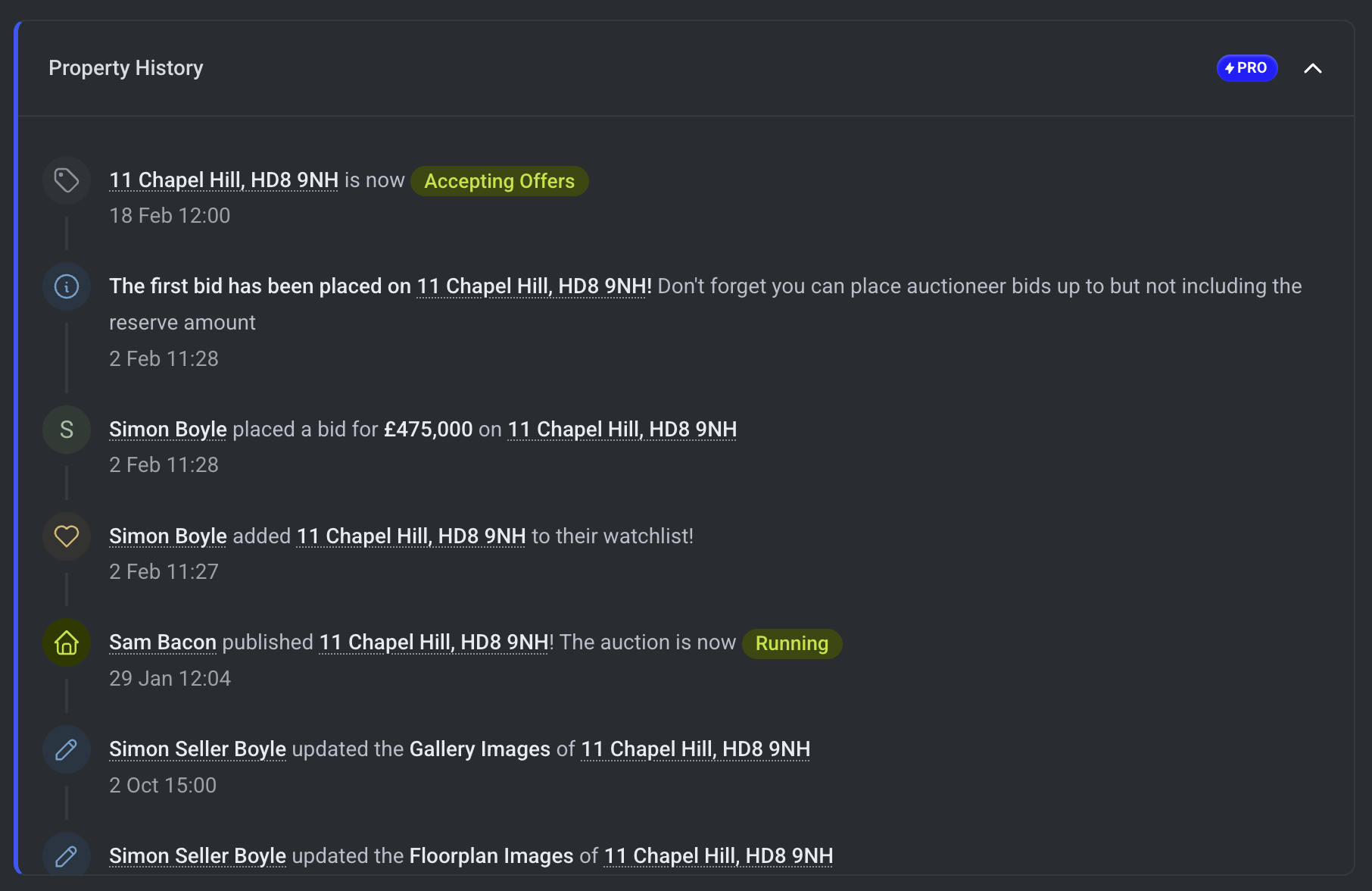 The activity feed gives you instant access to track recent actions on your listings - new bids, registrations, offers, and status changes - all in one live stream.